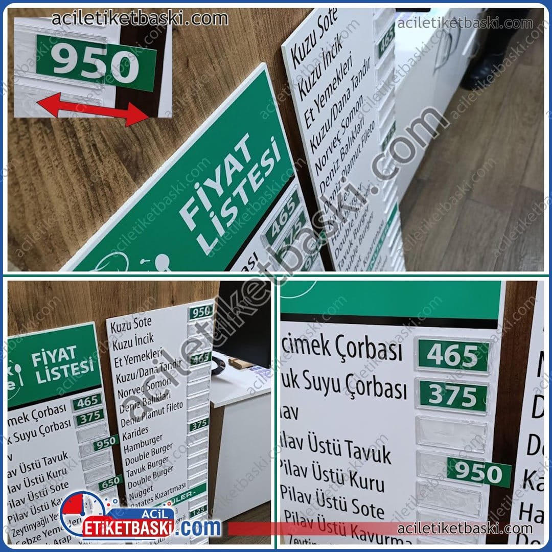 Fiyatlarınız sık sık mı değişiyor? Size özel çözümümüzle tanışın! Duvar ve camlarınız için tasarladığımız değişebilir fiyat listeleri, menünüzdeki ürün fiyatlarını kolayca güncellemenizi sağlar. 32x200cm standart ölçümüz (veya istediğiniz ölçüde) dış mekan dayanıklı malzemeden üretilir, uzun yıllar kullanım sunar. Özel tasarımımız sayesinde, bir ürünün fiyatını değiştirmek için tüm tabelayı yenilemenize gerek kalmaz. Tasarım ekibimiz, menünüze uygun şablonu oluşturur. Acil baskı merkezimizle, ihtiyaç duyduğunuzda hızlıca yedek içerikler de üretebiliriz.