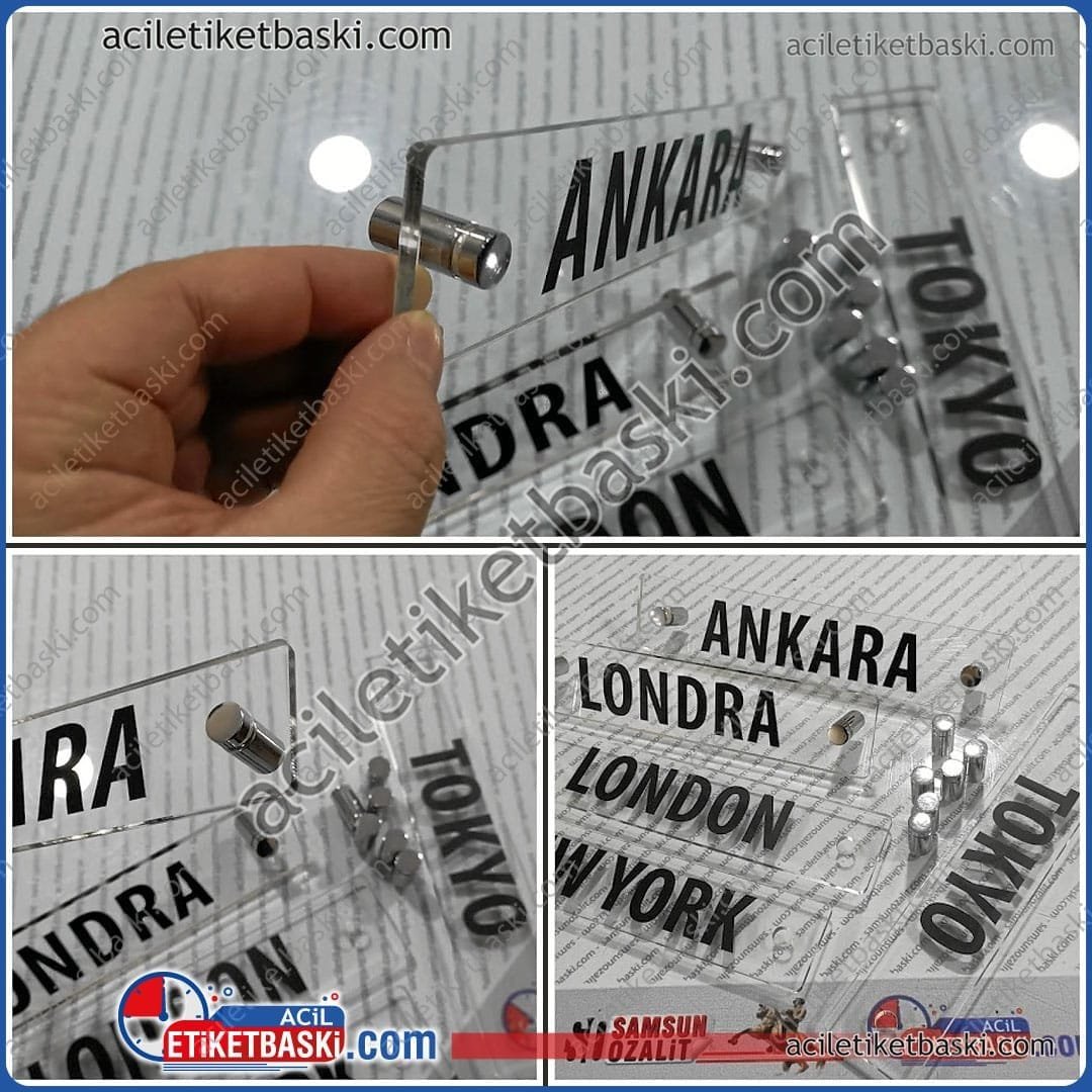 Designed for displaying city names under world clocks, this 5 mm clear acrylic signage offers durability and elegance with its decorative screw mounting. Featuring vinyl-cut lettering, it withstands indoor and outdoor conditions such as sunlight and humidity. Ideal for hotels, offices, reception areas and corporate environments. Custom sizes, fonts, and city names can be produced upon request. With fast production options, it is perfect for urgent signage needs.