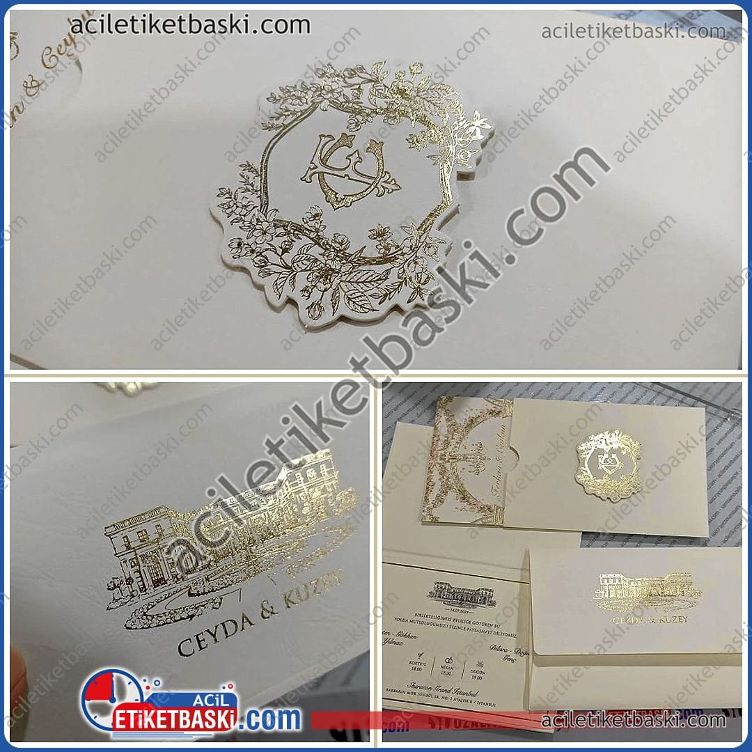 Yaldız ve varak baskılı davetiyeler, logolu veya amblem baskılı olarak üretilir.