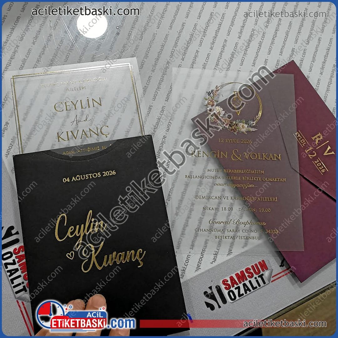Samsun Davetiye Baskısı – Şeffaf Asetat Üzeri Altın ve Gümüş Renk Baskı, Özel Tasarım Davetiye Üretimi
