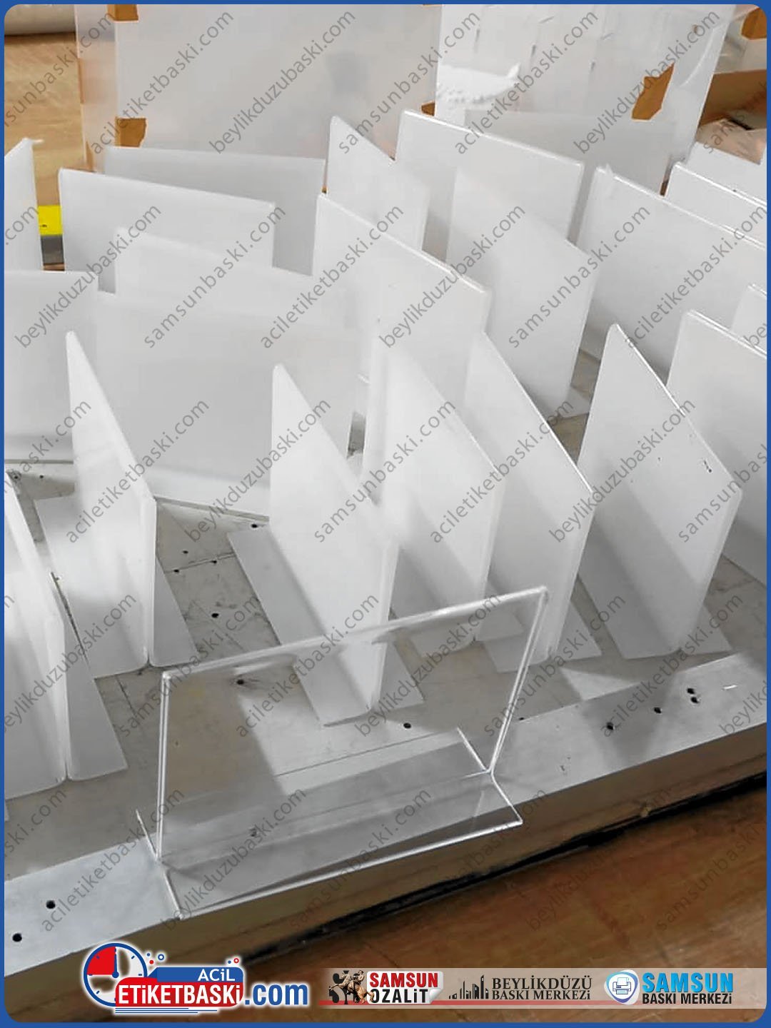 Restoran kafe otel ve ofis masaları için broşür menü veya duyurularınızı en estetik şekilde sergileyen yüksek ışık geçirgenliğine sahip kristal şeffaf pleksi malzeme Isıl işlemle gerçekleştirilen hassas büküm teknolojisi sayesinde pürüzsüz kenar yapısı ve devrilmeye karşı dengeli duruş sağlayan ergonomik L ve T tipi tasarımlar A4 ve A5 standart ebatlarının yanı sıra kurumsal ihtiyaçlarınıza yönelik özel ölçülerde üretilebilen içeriğin kolayca değiştirilmesine imkan tanıyan pratik yapı Çizilmelere karşı dirençli sararma yapmayan ve uzun yıllar şeffaflığını koruyan ithal pleksiglas panel kalitesi ile profesyonel sunum desteği Samsun üretim merkezimizde adede göre değişen avantajlı fiyat seçenekleri ve acil siparişleriniz için aynı gün imalat imkanıyla sunulan kaliteli çözüm
